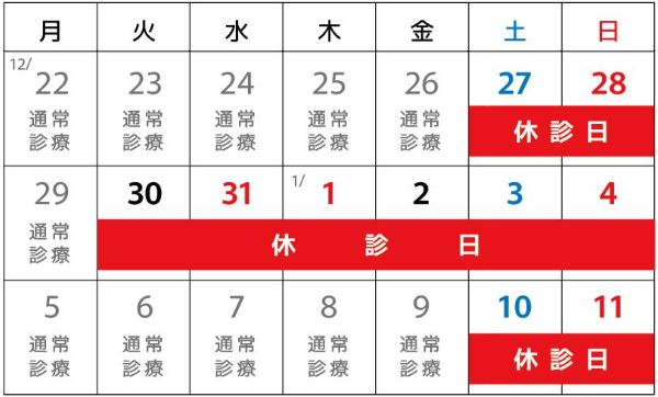 2025年12月30日(火)~2026年1月4日(日)までは下記の通り、休診日とさせていただきます。
