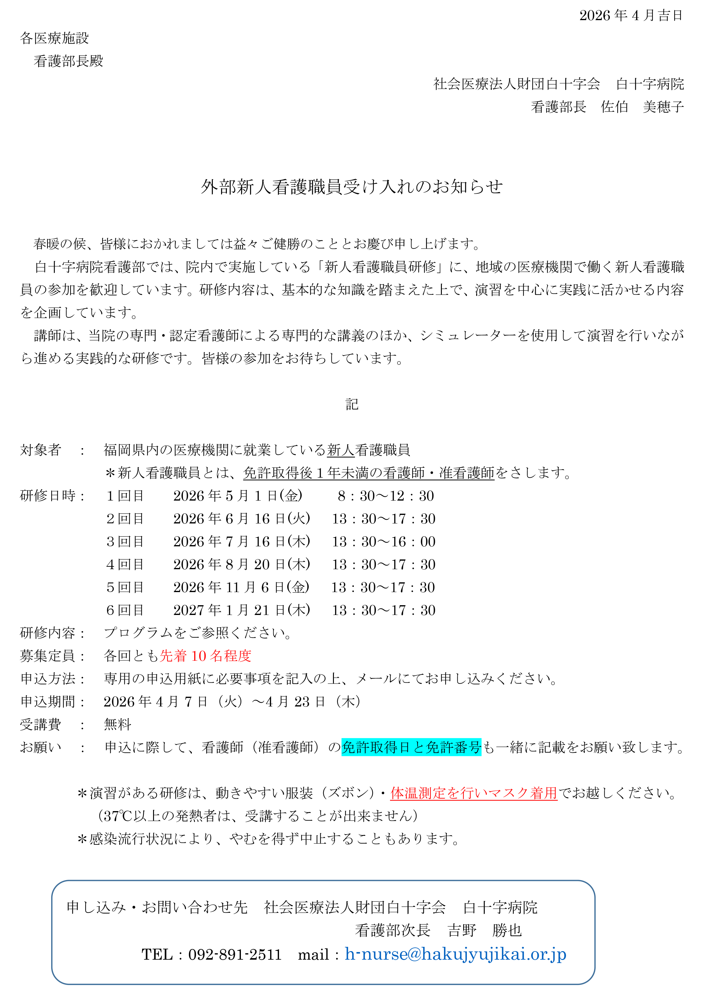 外部新人看護職員研修受け入れのお知らせ♪ 締切2026/4/23