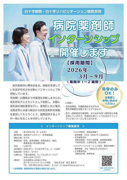 | ・ | 連絡先 | : | 社会医療法人財団白十字会 白十字リハビリテーション病院 薬剤部 主任 長江 真智子 TEL:092-891-2611(代表番号 ) E-mail: m.nagae@hakujyujikai.or.jp ※採用期間、勤務時間など個別に相談に応じます。 |
