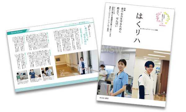 今号では、小川医師より「食べる力を守るために」と題し、食べる動作についての仕組みや、摂食嚥下障害についてお話していただきました。また「教えて!せんぱい」では当院の医療ソーシャルワーカー(MSW)と言語聴覚士(ST)の仕事について特集しています。